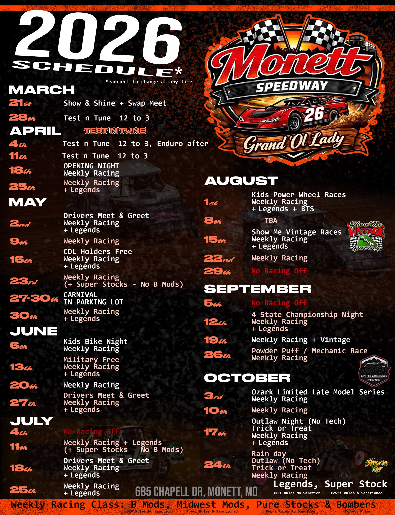 No racing this Friday at Monett Motor SpeedwayNo Racing this Friday, Aug. 29. Stay tuned for schedule updates.